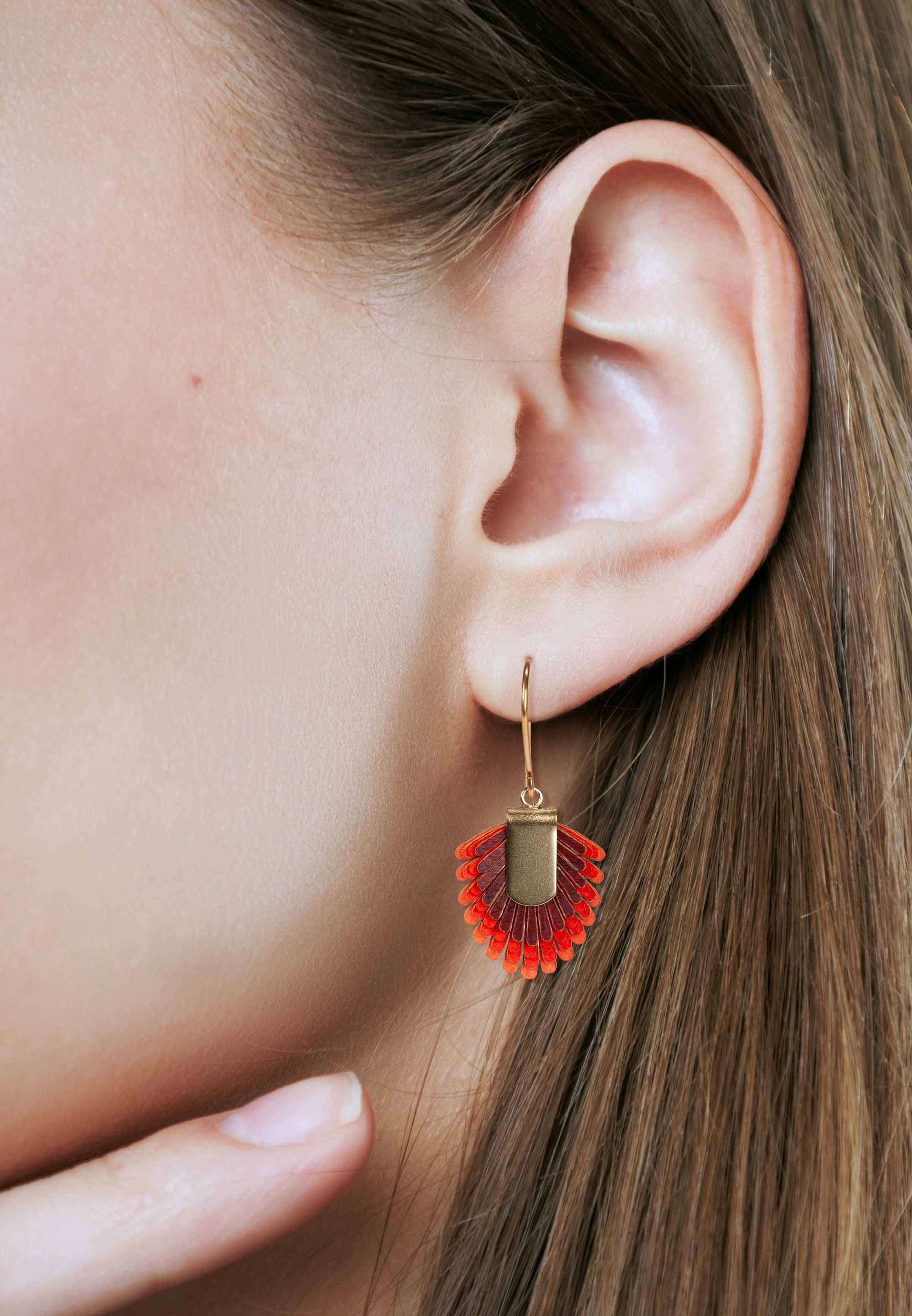 Das Design des Pam Pem Earring S von Gretchen kombiniert meisterlich die kontrastierenden Materialien aus natürlichem Pergament und glattem Messing. Die lebendige, gezackte Form in farbenfrohen Tönen erinnert an Vogelfedern. Dank des sehr geringen Gewichts des Naturmaterials Pergament sind diese Ohrringe im wahrsten Sinne des Wortes "federleicht" und bieten einen ganz besonderen Tragekomfort.