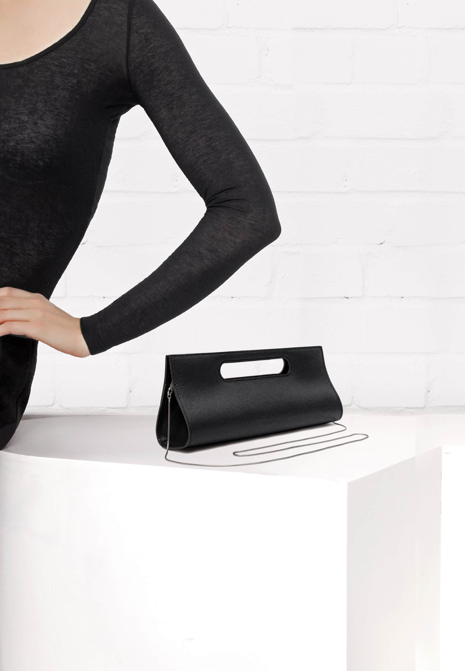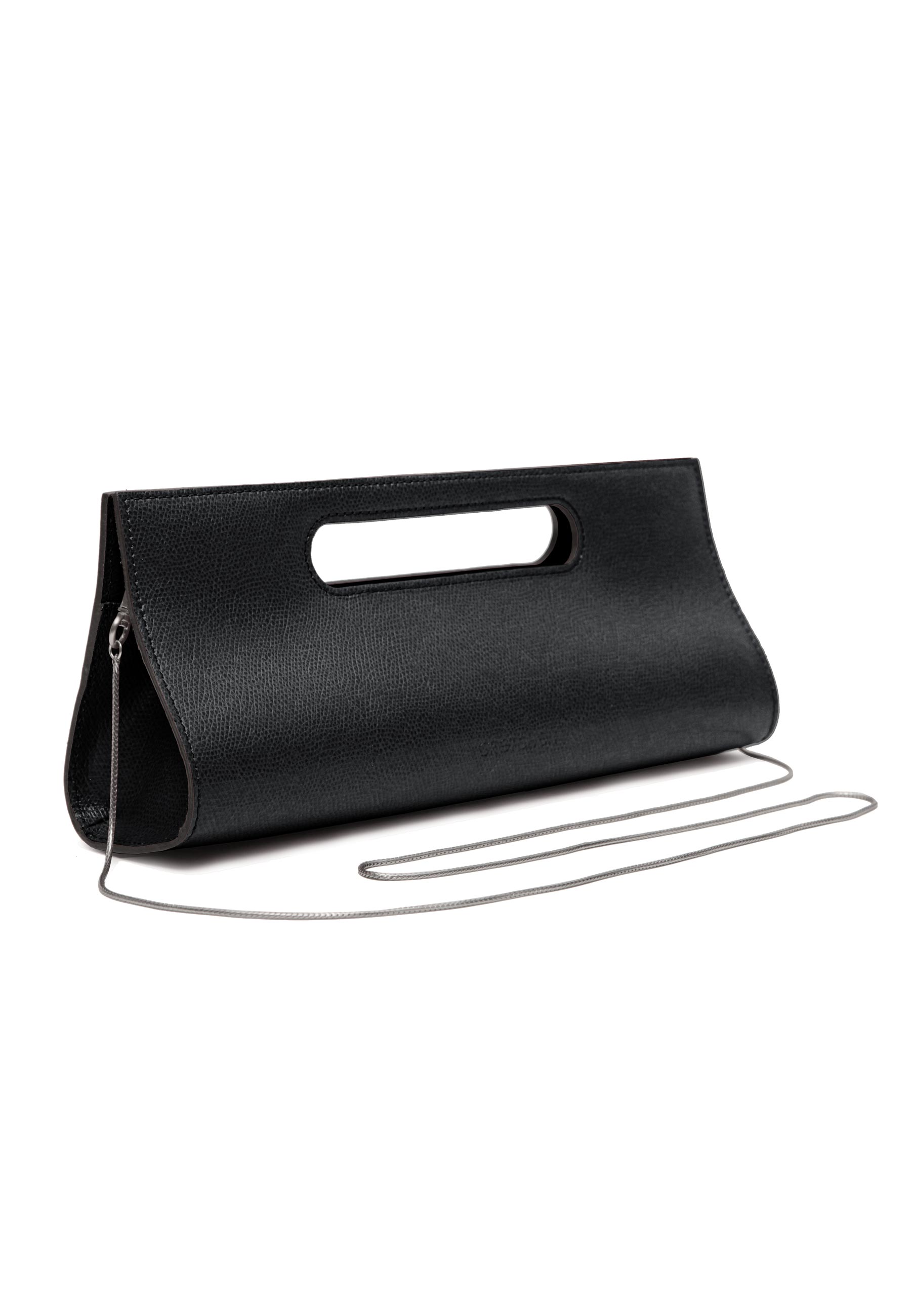 Formvollendet puristisch zeigt sich die Chouchou Clutch. Die längliche, sogenannte Baguette-Form wird durch den ovalen Ausschnitt der als Griff dient optisch aufgelockert. Der von der Seite betrachtet tropfenförmige Schnitt der Tasche ist am Boden abgeflacht, so dass die Tasche sicher steht ohne umzufallen. Verdeckt auf der Innenseite der Öffnung eingearbeitete Magnete sorgen dafür das die Tasche sicher geschlossen bleibt. Ein langes Reißverschlussfach im Inneren bietet sicheren Stauraum.Mit der abnehmbaren filigranen Schulterkette können Sie Ihre Chouchou nicht nur am Kurzgriff gehalten oder unter den Arm geklemmt als Clutch-Bag tragen sondern auch seitlich auf der Schulter.Dank des minimalistischen Designs lässt sich diese Clutch dabei besonders vielseitig kombinieren zu sportiven Abend-Outfits mit Bluse und Jeans ebenso wie zum modernen Abendkleid.Aus hochwertigem italienischem Rindsleder gefertigt wird Ihnen Ihre Chouchou Clutch lange Freude bereiten!