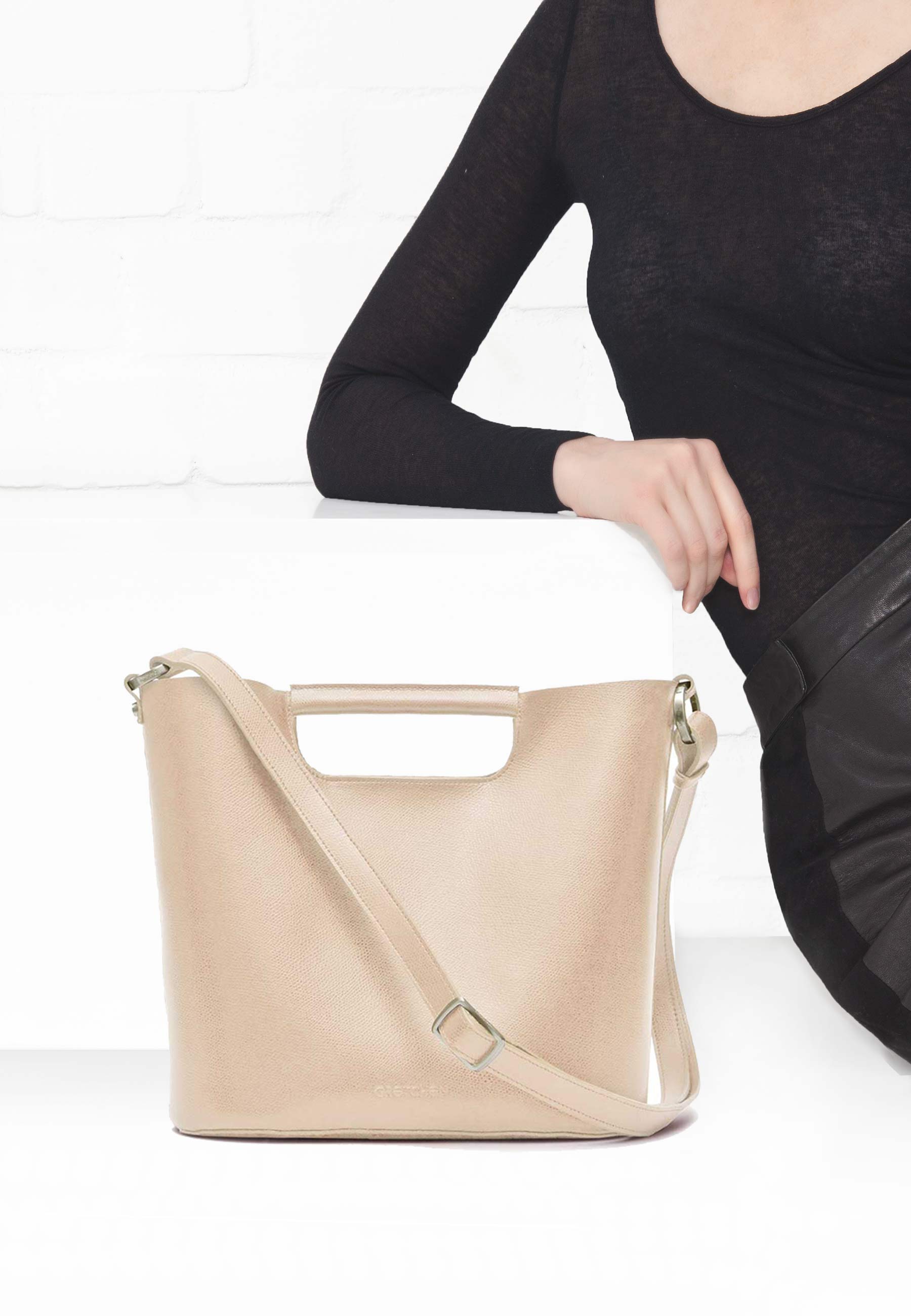 - Elegante Kurzgriffe und längenverstellbarer Schultergurt